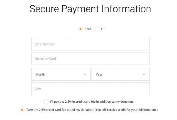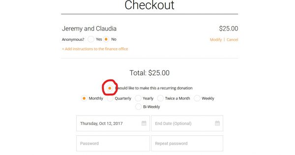 Choose “I would like to make this a recurring donation. Then choose your start date and also setup a password if you would like to make adjustments or changes in the future. You can leave the password box blank.